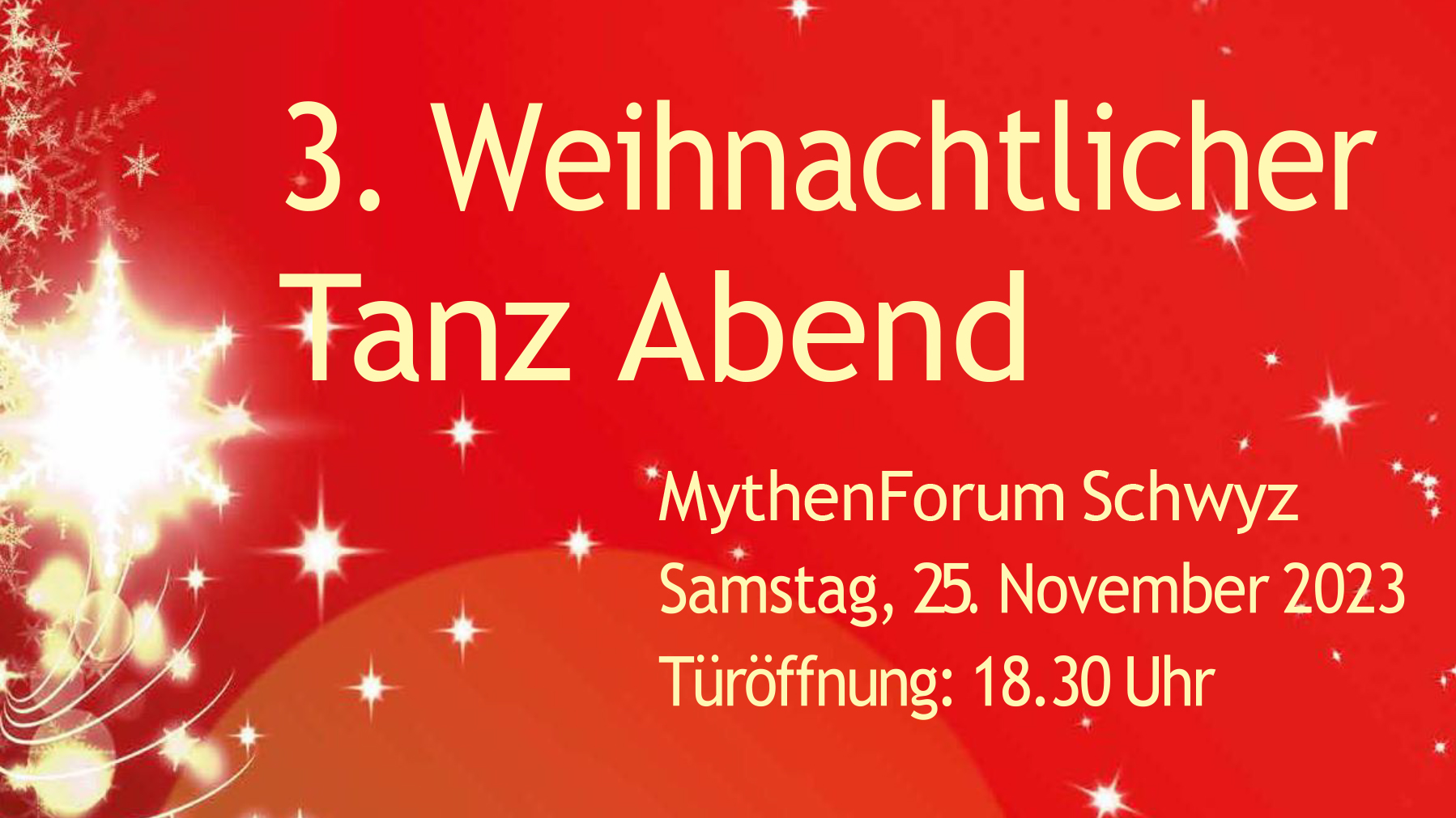 Angebot Willkommensapéro und saisonales 3-Gang Menü Live-Band Grosser Saal mit ca. 180 m2 Tanzfläche kostenloses Parkticket im Parking des MythenForum Programm 18.30 Uhr: Türöffnung und Apéro19.15 Uhr: Tanzbeginn20.00 Uhr: Vorspeise00.30 Uhr: Ende der Veranstaltung Menü Apéro: 1 Glas ...