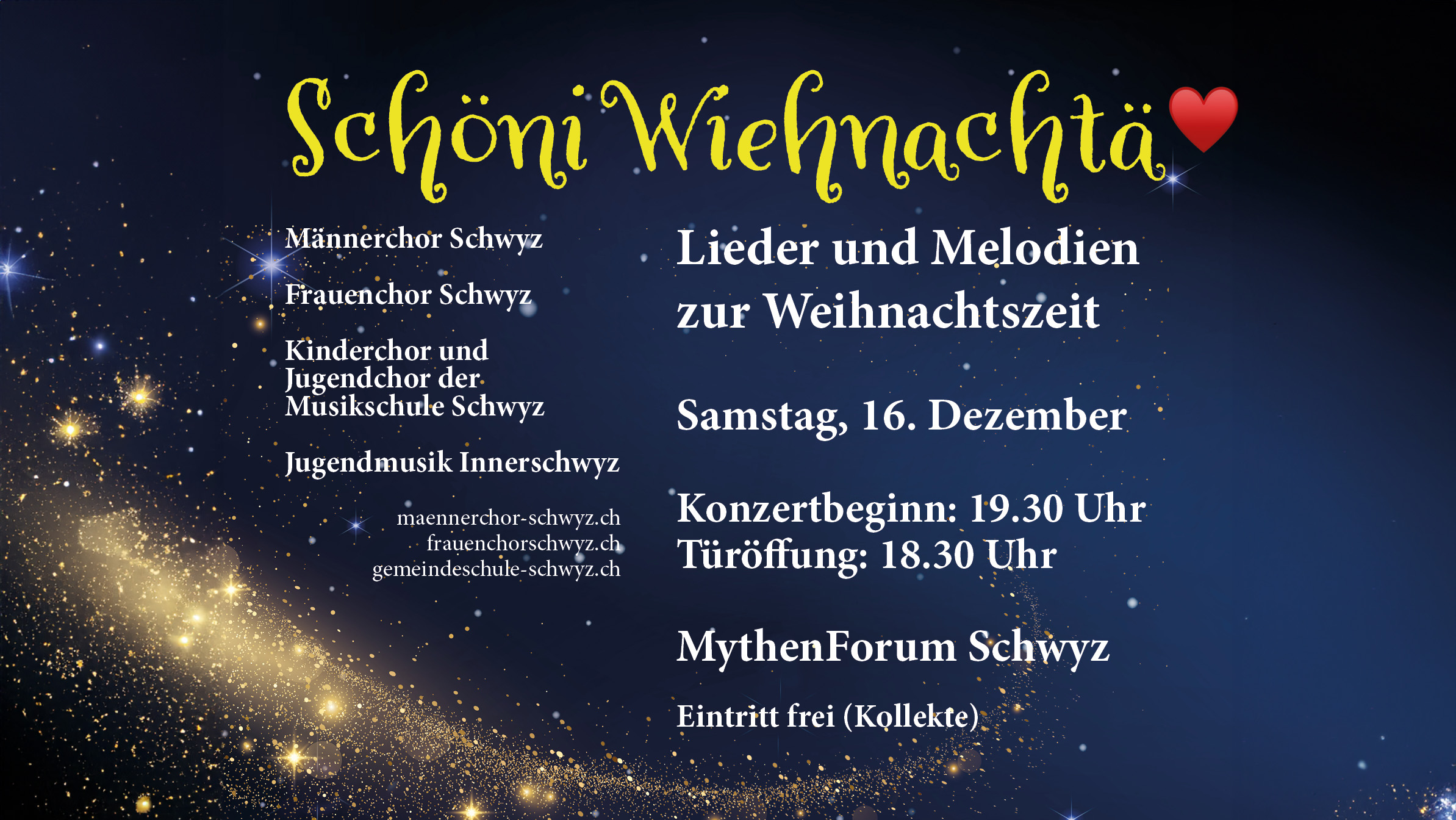 Der Männerchor, Frauenchor, Kinderchor, Jugendchor und die Jugendmusik Innerschwyz laden ein zum Weihnachtskonzert «Schöni Wiehnachtä» am Samstag, 16. Dezember 2023. Der Eintritt ist frei (Kollekte). Tickets & Mobilität Kaufe Tickets nur von öffentlichen Plattformen (vermeide inoffizielle...